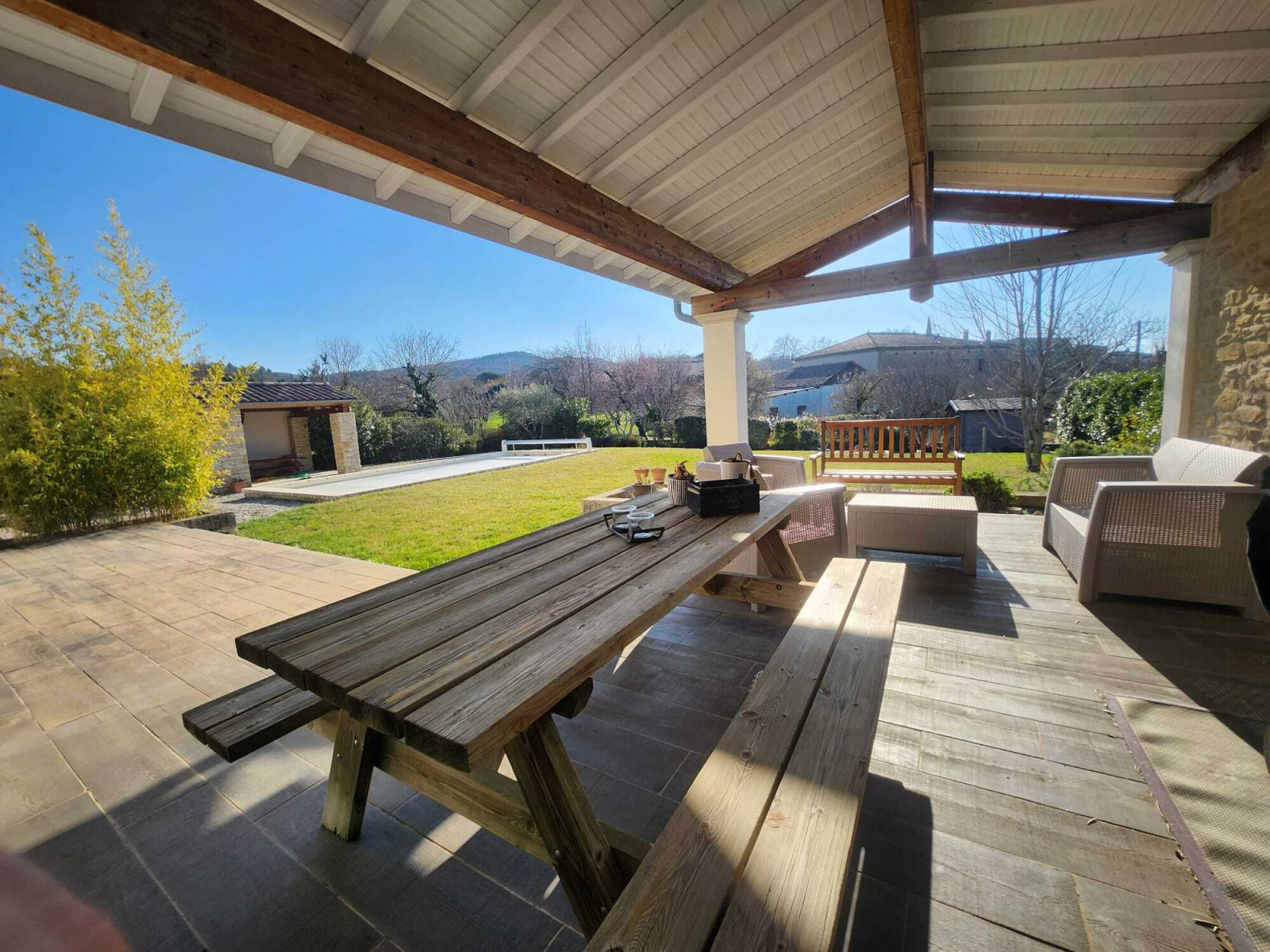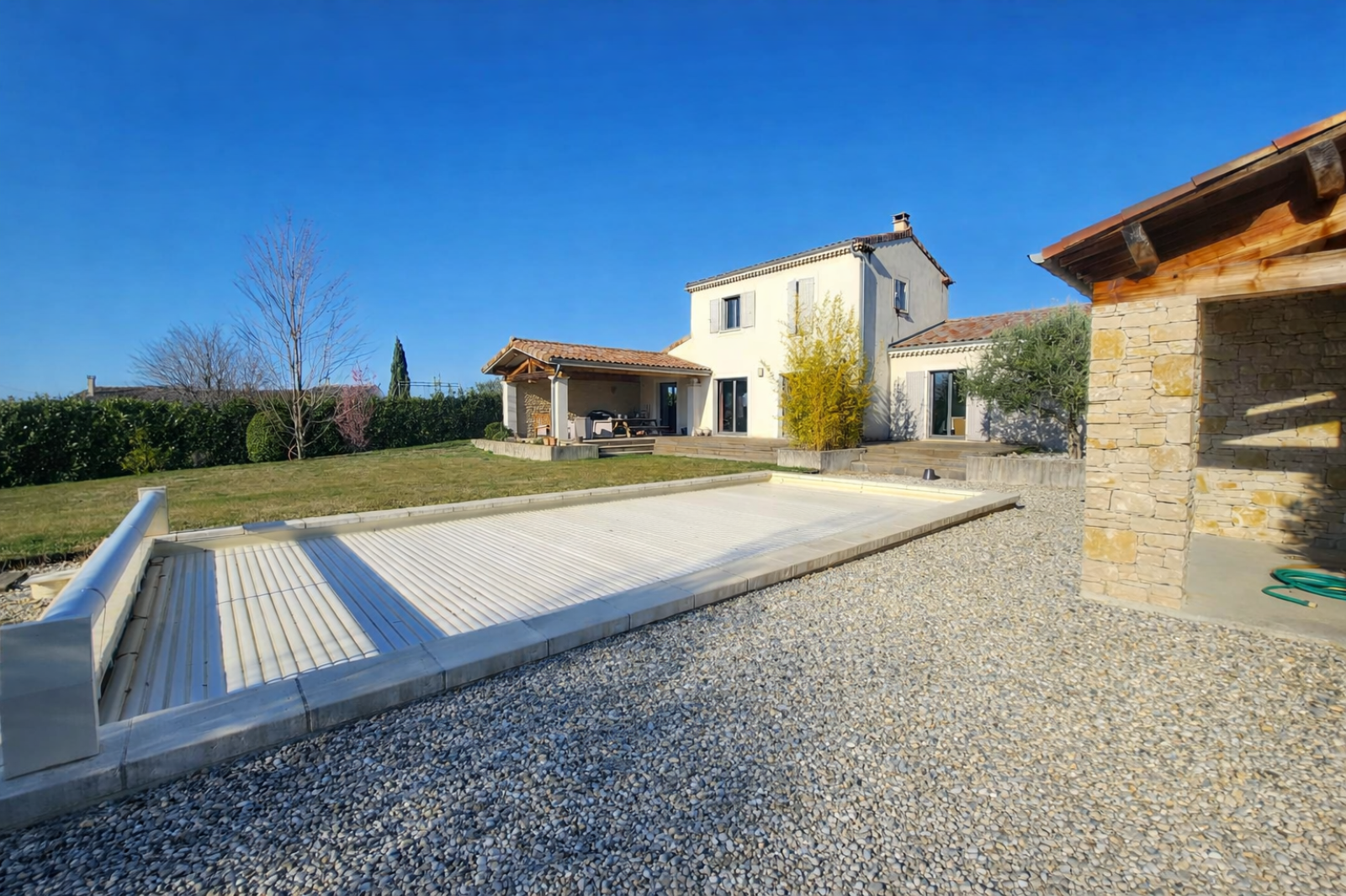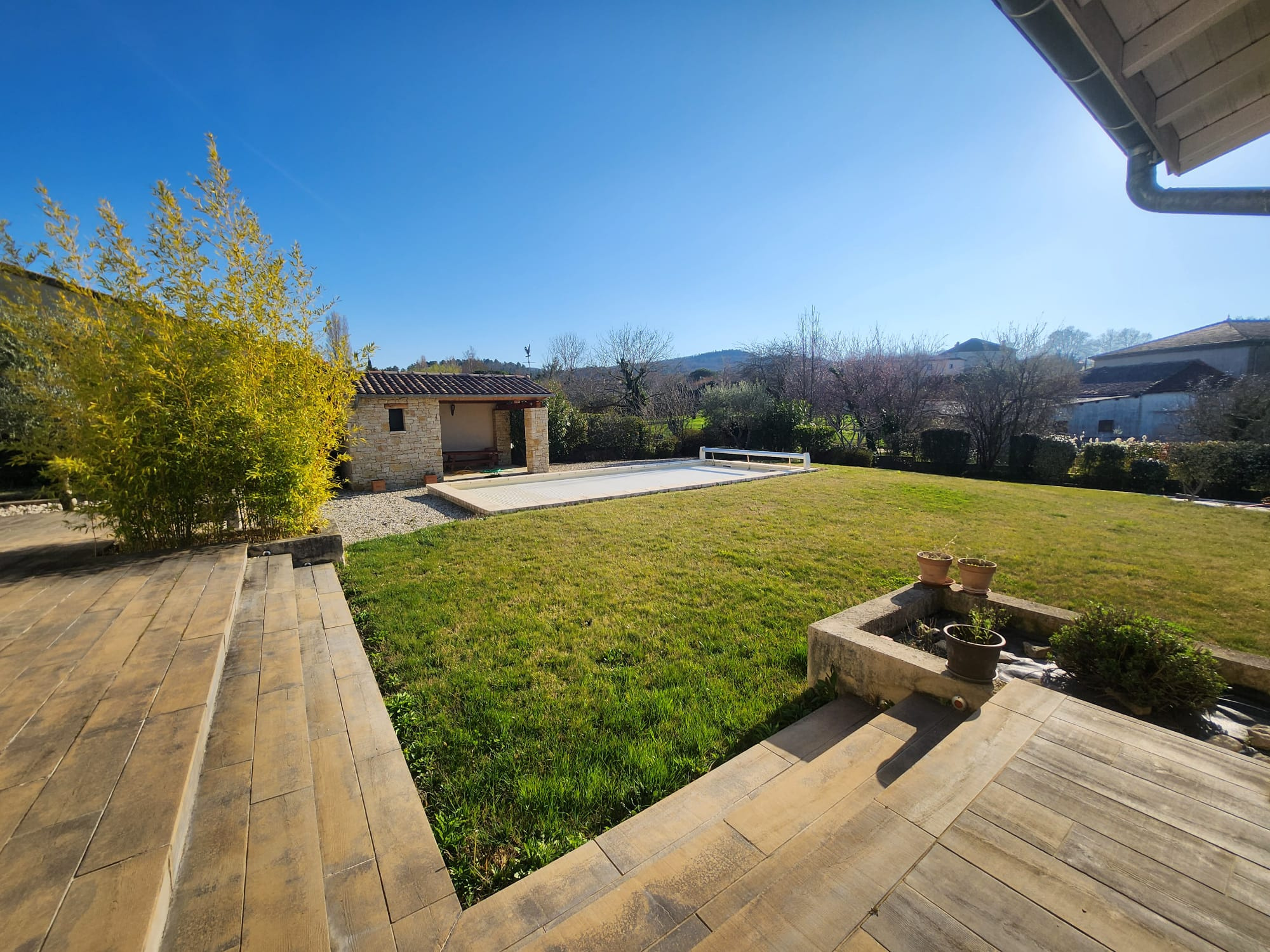 La pièce de vie de 60 m², véritable cœur de la maison, propose un espace lumineux et convivial ouvert sur une magnifique terrasse couverte propice aux réceptions estivales. Celle-ci communiquant directement avec la cuisine par une porte à galandage prolonge naturellement l’intérieur vers un terrain paysagé de 1 600 m², parfaitement exposé et offrant une vue dégagée. L’extérieur accueille une piscine avec PVC armé et volet roulant de sécurité, un pool-house , un garage d’environ 30 m², un carport, un cellier et une buanderie. Un ensemble harmonieux et fonctionnel, idéal pour une vie familiale épanouie.